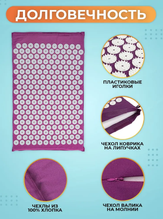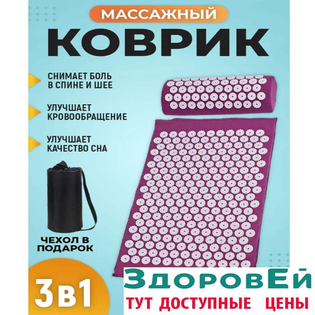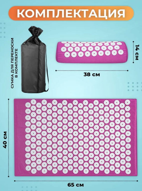 Аппликатор Кузнецова - мощное средство рефлексного действия на тело человека в виде коврика и валика с игольчатыми элементами. Массажное устройство с нажимом накладывается на определённую область с оздоровительной целью. Поставляется в виде комплекта 3 в 1: игольчатый коврик, игольчатый валик (подушка) и сумка для переноски комплекта.
