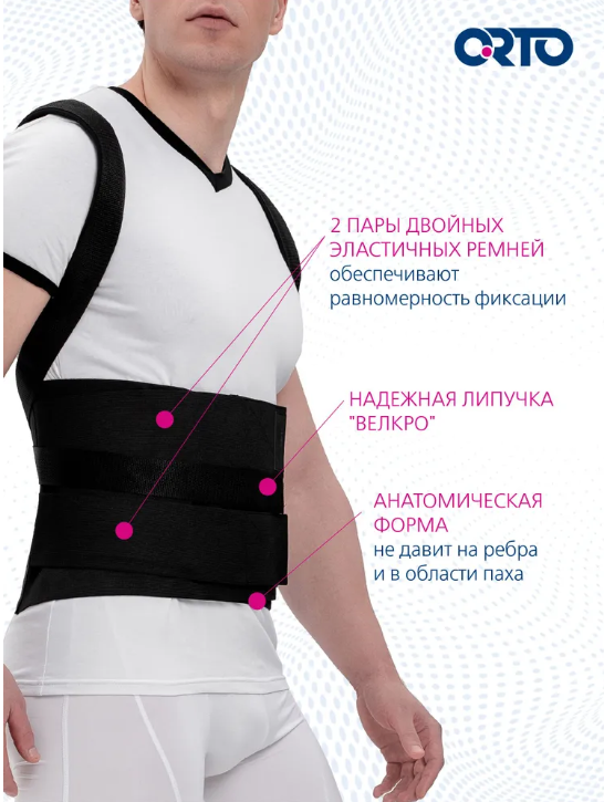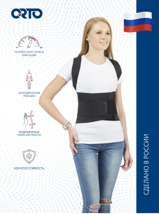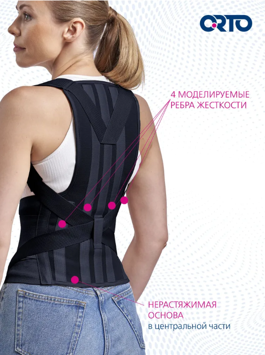 Корректоры осанки торговой марки ORTO изготавливаются из дышащих материалов, не вызывающих раздражение и чувство дискомфорта. Корректная конструкция изделия аккуратно разводит плечи, способствует поэтапному формированию правильной осанки и фиксации тела в анатомически правильном положении. Положительный эффект от использования корректора осанки позволяет рекомендовать его в качестве лечения и профилактики деформаций позвоночника.