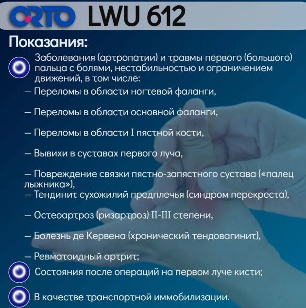 Показания к применению:• заболевания (артропатии) и травмы первого (большого) пальца с болями, нестабильностью и ограничением движений, в том числе: