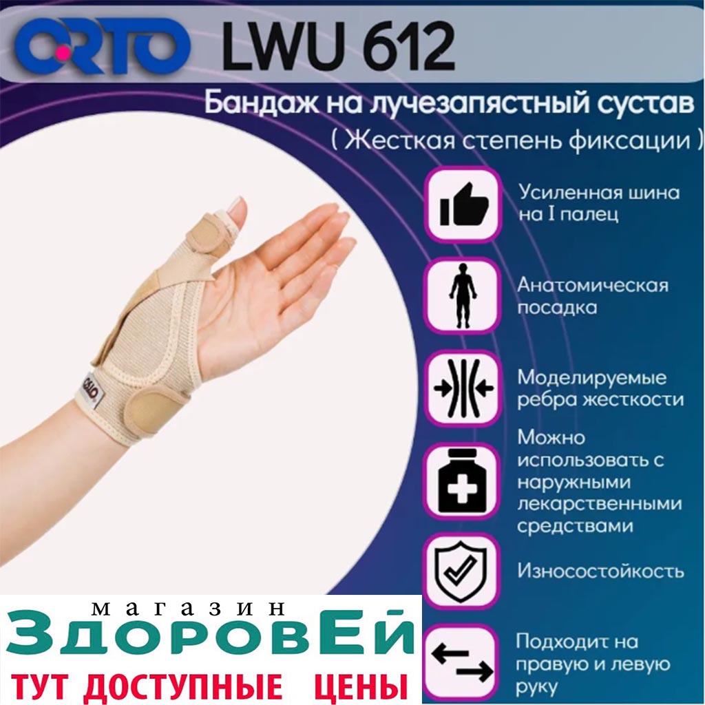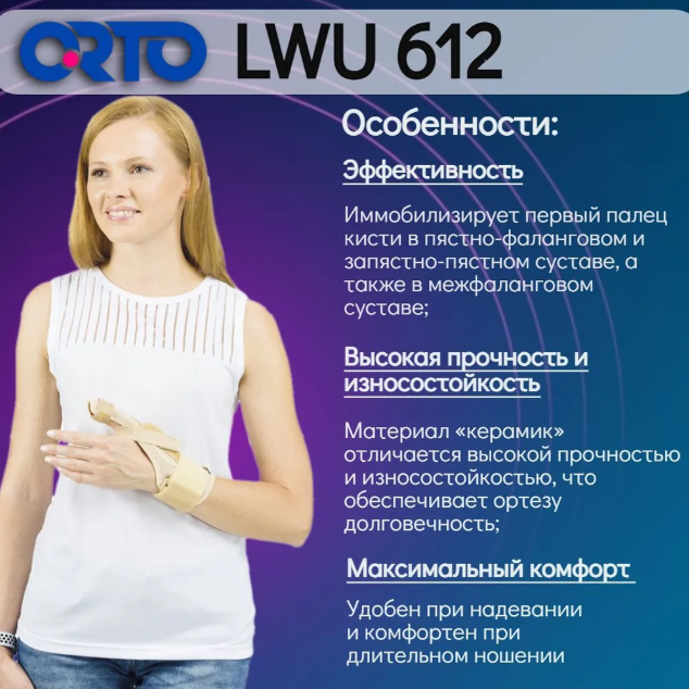 Ортез на лучезапястный сустав (на кисть), бандаж на руку, на запястье, ORTO LWU-612 (LWU 612)Разъемный ортез с моделируемым ребром жесткости в проекции первого (большого) пальца. Длина ребра жесткости 12,5 см. Фиксация ортеза на запястье осуществляется широким ремнем с застёжкой «Велкро». По краям основы имеются мягкий кант и дополнительный фиксирующий ремень для первого (большого) пальца. Края ортеза соединены двумя эластичными вставками. Основной материал ортеза — нить с керамическим напылением (материал «керамик»).