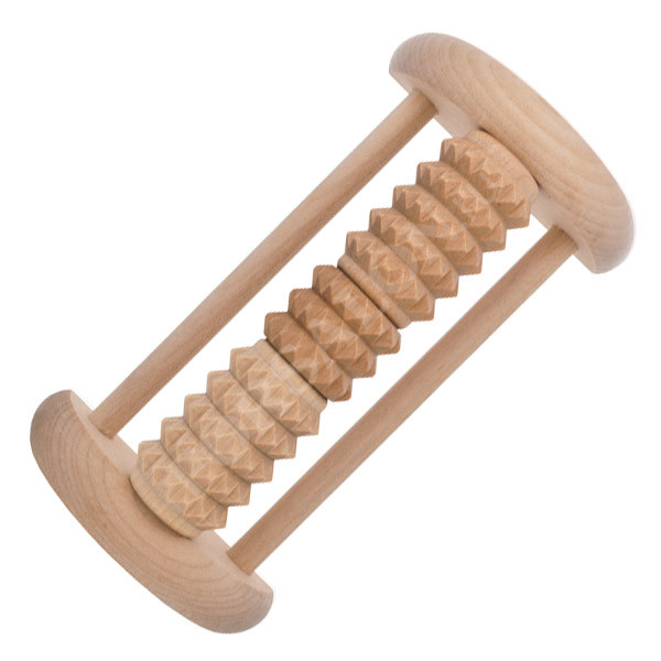 Массажер из натурального дерева с вращающимися элементами. Позволяет снимать мышечное напряжение и усталость с ног, может использоваться на других зонах тела.