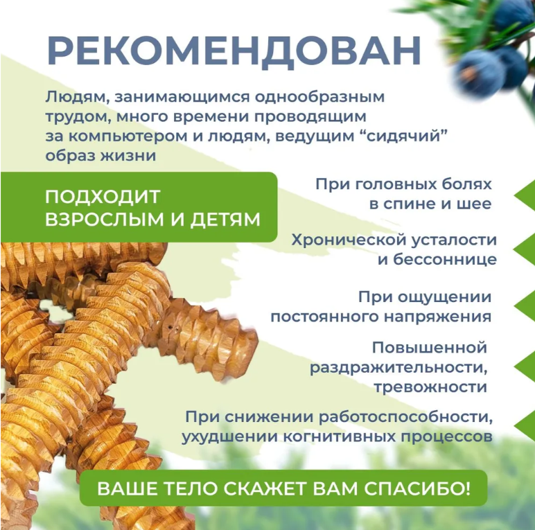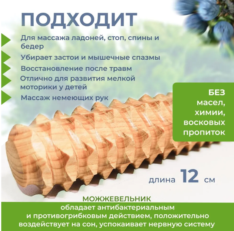Массажер из можжевельника предназначена для массажа ладоней, стоп, спины. Массажер в виде палочки аккуратно массирует активные точки на руках, ногах и теле. Аромат можжевельника обладает антибактериальным действием, положительно воздействуют на сон, успокаивают нервную систему. Рекомендован как взрослым, так и детям. Массажер палочка развивает тактильное восприятие, мелкую моторику. Пользуясь деревянным массажером Палочка из дерева , вы не только тонизируете мышечный каркас, избавляетесь от целлюлита, но и воздействуете на кисти рук. Тупые зубчики не царапают кожу, но при этом сильно воздействуют на все акупунктурные точки. Благодаря этому снимается нервное напряжение, тонизируется организм, улучшается эмоциональное состояние. Благодаря аккуратной обработки и натуральному и экологичному дереву подходит для детей. Подходит для детей. Ничем не обработана. Без химии и пропиток!! Только натуральное дерево.