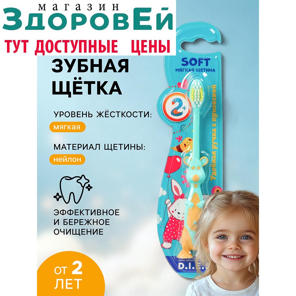 Детская зубная щетка D.I.E.S. " Мышка " мягкая. Щетка бережно удаляет налет с зубов и предотвращает появление зубного камня.