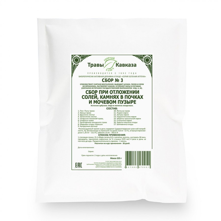 Способствует снятию воспаления, растворяет камни, выводит шлаки, песок и соли из организма. Устраняет боль в суставах. Сбор выполнен из прекрасно работающих трав размягчающих, дробящих и выводящих из организма солевые отложения и камни различного происхождения. Трава пол-пала, марена, пырей- камнедробящие компоненты. Спорыш, хвощ, брусника, толокнянка- имеют мочегонное свойство, способствуют выведению песка и солей из организма. Морковь, петрушка, кукурузные рыльца, трава золотарника снимают воспаление почек и мочевыводящих путей. Стальник, лопух, морковь, укроп оказывают обезболивающее и противоинфекционное действия.Примечания
