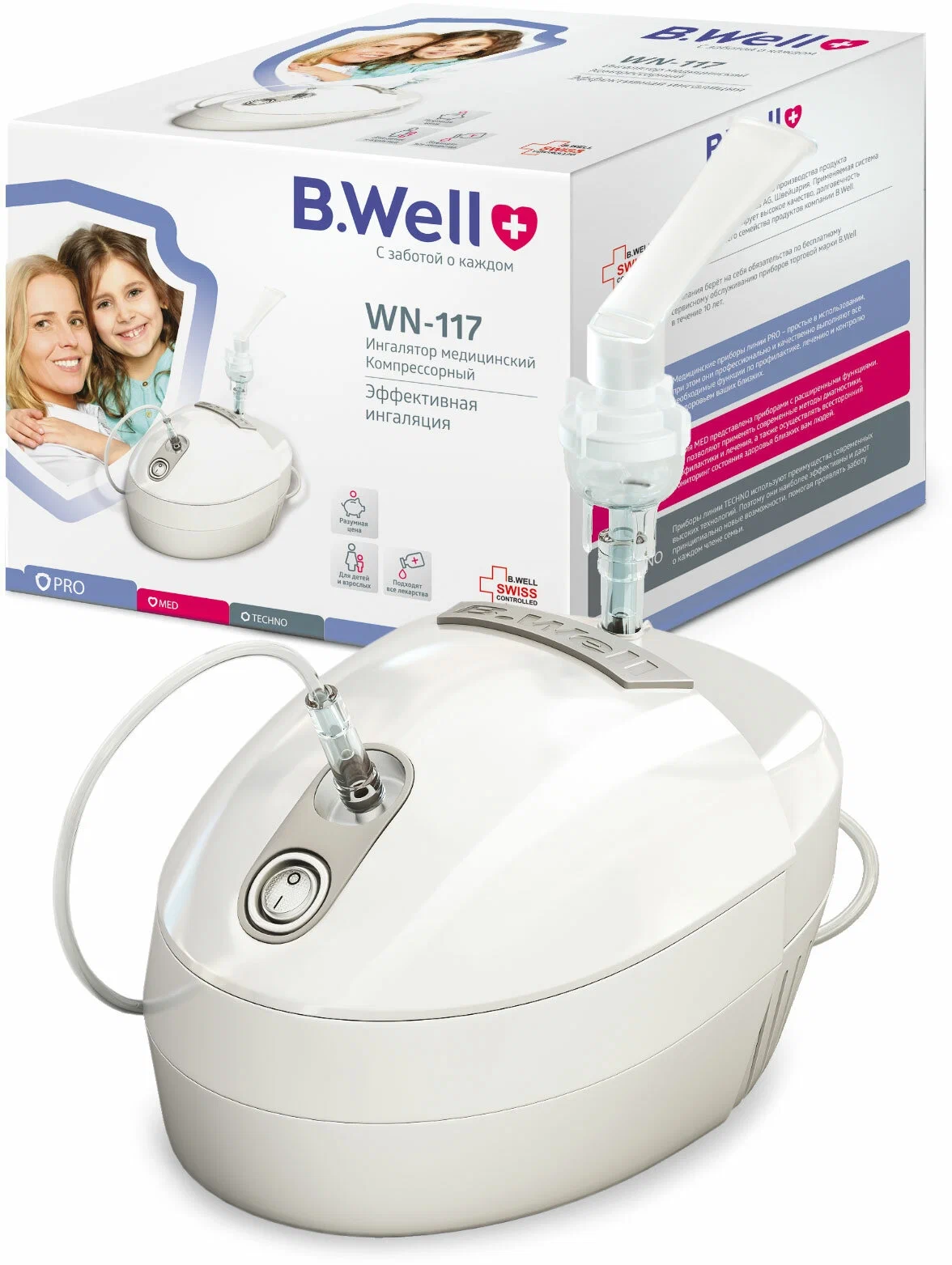 Компрессорный небулайзер B.Well WN-117 доступен для каждой семьи. Это компактный, простой и надежный прибор, который может работать без перерыва до 30 минут и оснащен температурной защитой от перегрева.
