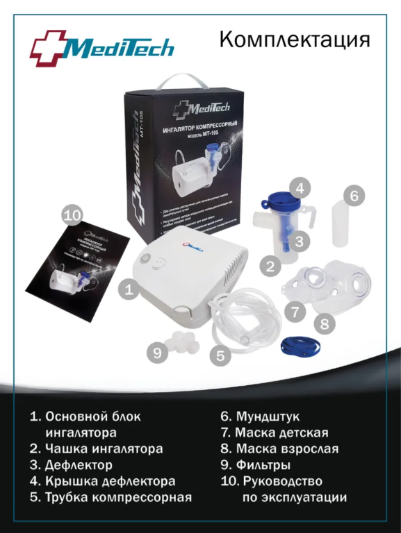 • ингалятор; • небулайзерная камера (колпачок, дефлектор, чашка для лекарственного средства); • мундштук; • маски для лица (2 шт. - для взрослого человека и ребенка); • запасные фильтры (5 шт.); • компрессорная трубка; • руководство по эксплуатации; • упаковочная коробка.