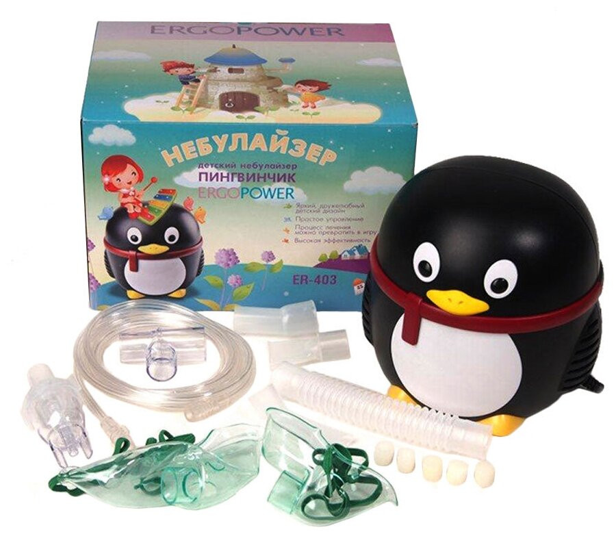 Комплектация : небулайзер, мундштук, Т-переходник, 5 фильтров, стакан, шланг, детская и взрослая маска, разветвитель.