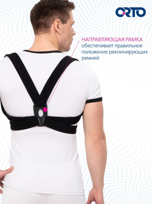 Корректор осанки детский (реклинатор), с мягкими реклинирующими ремнями и круглой центральной направляющей рамкой. Фиксация реклинатора осуществляется с помощью застежек «велкро».