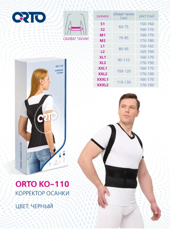 Ортез ORTO КО 110 с разъёмной основой анатомической формы, нерастяжимой центральной частью и эластичными боковыми частями. Фиксирующие элементы представлены в виде двух моделируемых рёбер жёсткости, расположенных вдоль позвоночника. Элементы коррекции ― реклинирующие ремни ― прикреплены к основе и снабжены смягчающими вставками, обеспечивающими комфорт в процессе ношения. В центральной части основы располагается шлёвка для удержания реклинирующих ремней. По краям боковых частей основы и на реклинирующих ремнях расположены застёжки «Велкро».