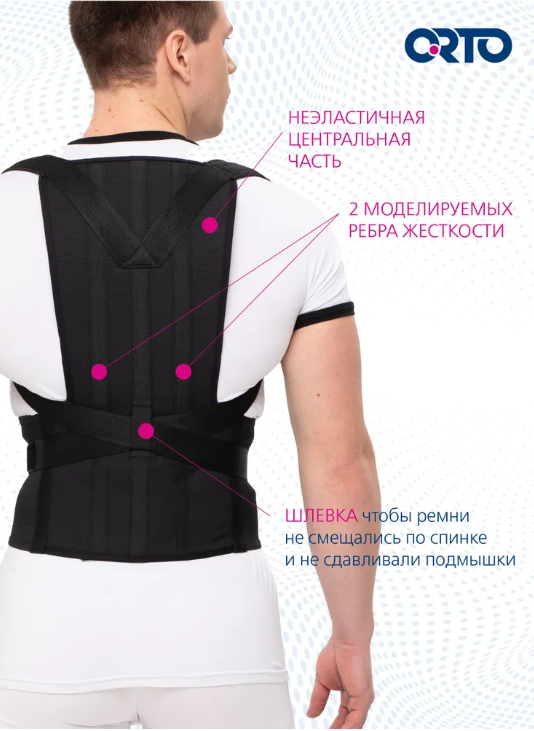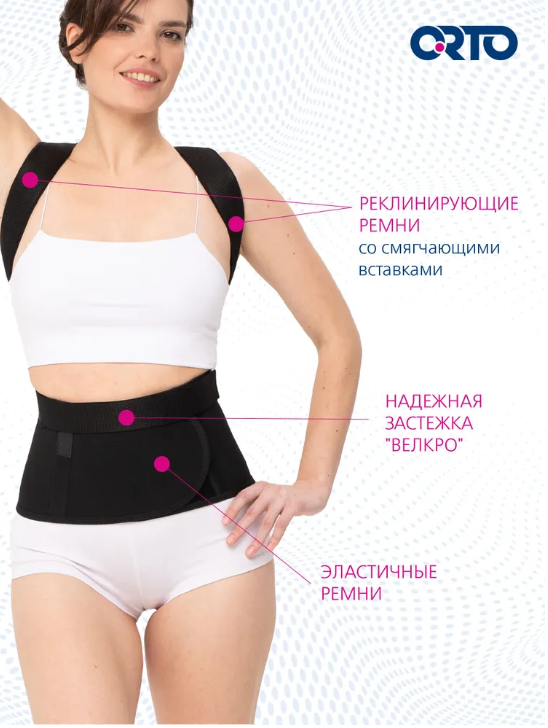 Устраняет деформации грудного отдела позвоночника, фиксирует положение физиологической осанки при помощи реклинирующих ремней.