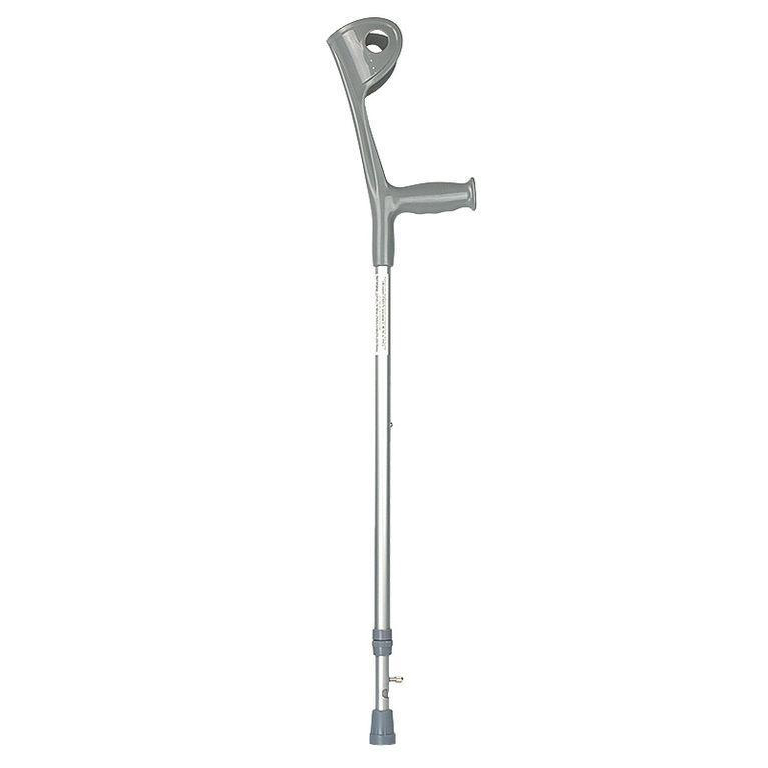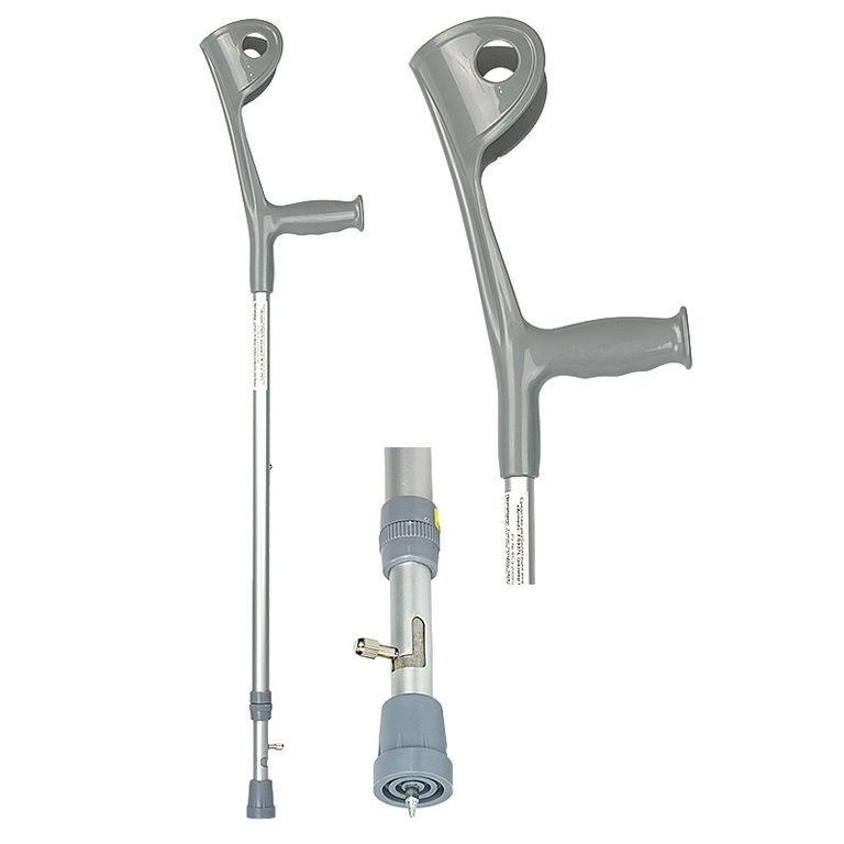 Костыли E 0504У изготовлены из прочного и очень легкого алюминиевого сплава. Рукоять и опора предплечья данного изделия выполнены из специального полимерного материала. Локтевые костыли регулируются по высоте при помощи системы пружинных стопоров, а также имеют дополнительное фиксирующее кольцо. Изделие создает дополнительную опору, что защищает пациента от падений и дополнительных травм. Более того, костыли снимают нагрузку с поврежденного участка тела. При использовании данных костылей опорной поверхностью являются кисть и предплечье пациента.