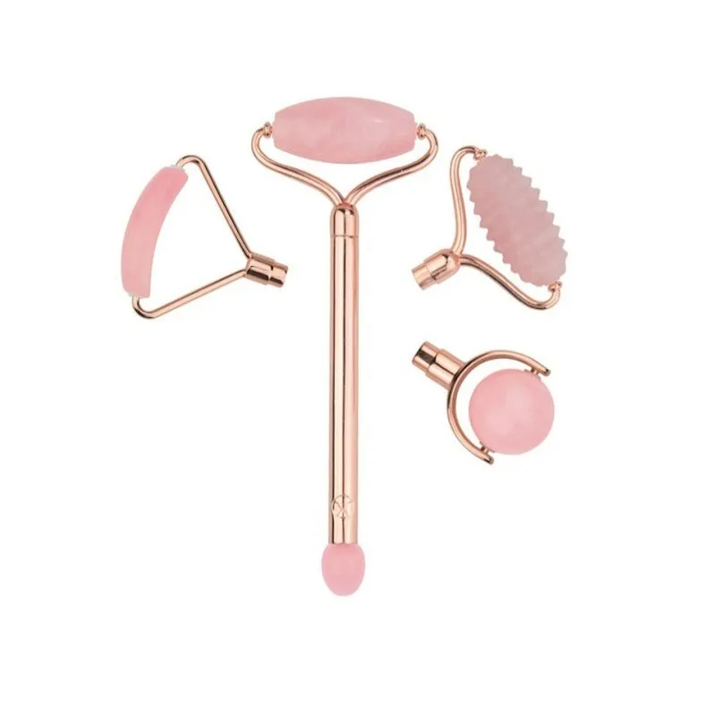 Двухсторонний роллер из розового кварца. сверху насадка будет большей, снизу — меньшей. Камень снизу насажен на стержень, сам он напоминает оливку по форме. При надавливании верхний минерал начинает крутиться как колесо, при этом полноценно обрабатывается кожа лица. Набор из розового кварца с насадками дополнен рельефными насадками, которые работают как скребок.