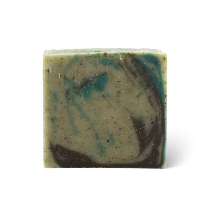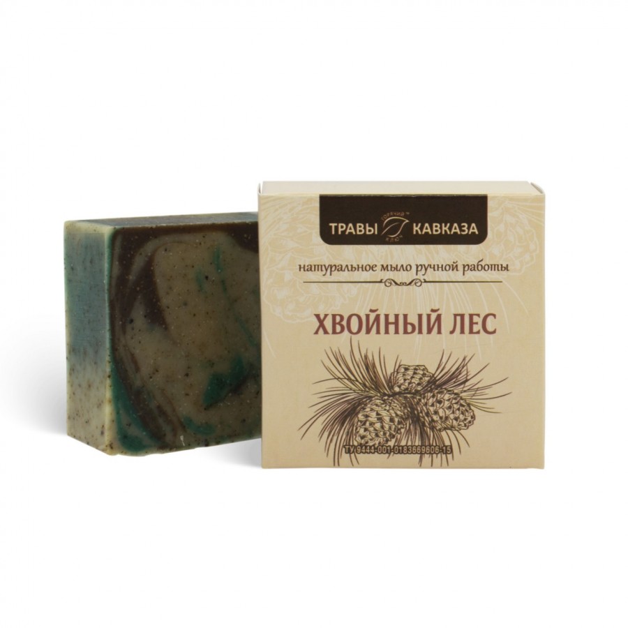 - Омыленные растительные масла (оливковое, кокосовое, пальмовое, касторовое), вода, крепкий настой еловой хвои, эфирные масла кедра, сосны, пихты, включения молотой хвои.
