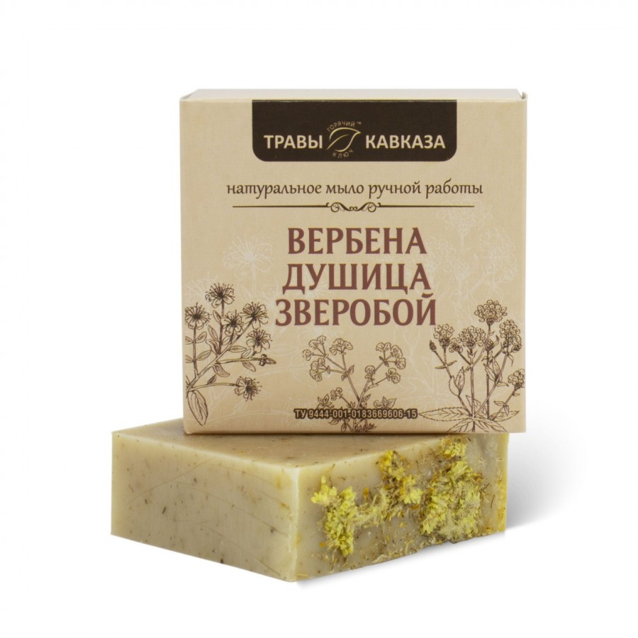 - Омыленные растительные масла (оливковое, кокосовое, пальмовое, касторовое), вода, натуральный экстракт зверобоя, вербены, душицы, эфирное масло вербены.
