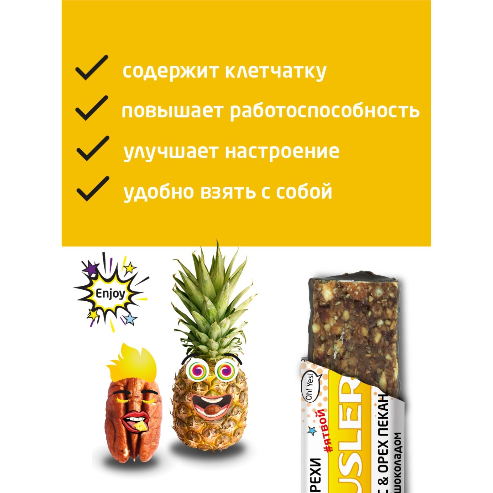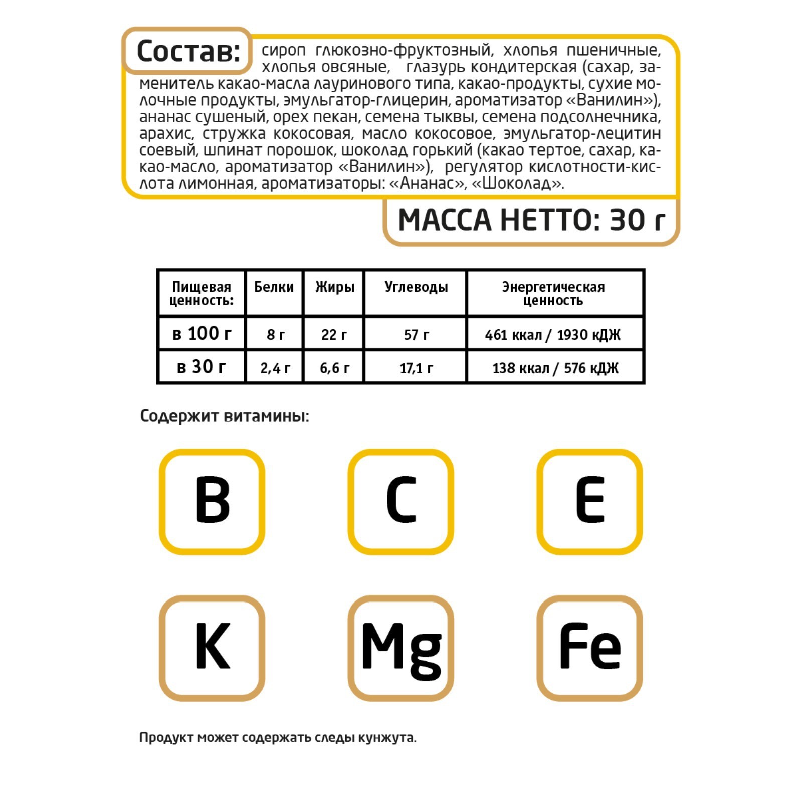 Состав: Сироп глюкозно-фруктозный, хлопья пшеничные, хлопья овсяные, глазурь кондитерская (сахар, заменитель какао-масла лауринового типа, какао-продукты, сухие молочные продукты, эмульгатор-глицерин, ароматизатор Ванилин), ананас сушеный, орех пекан, семена тыквы, семена подсолнечника, арахис, стружка кокосовая, масло кокосовое, эмульгатор-лецитин соевый,