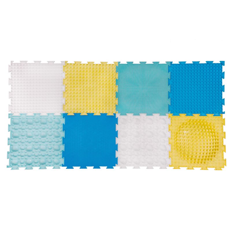 В набор «Чистюля» входят 8 ковриков - 2 «Льдинки» жёсткие, 2 «Трава» мягкая, 2 «Камни» мягкие, 1 «Островок» жёсткий, 1 «Шипы» мягкий.