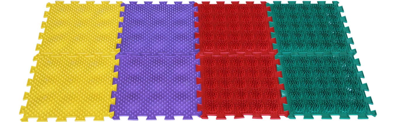 Модули выполнены из жесткого и мягкого материалов, что позволяет чередовать степень воздействия на подошвенные поверхности для увеличения эффективности занятий. После занятий на игольчатых поверхностях длительное время сохраняется легкость в ногах.