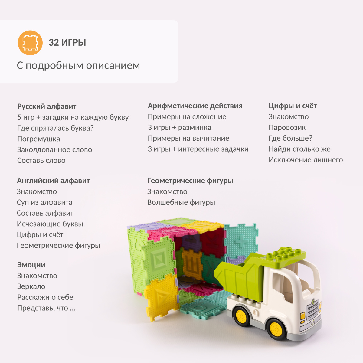 В набор входит: 80 мини-пазлов (6,5 см), из которых можно собрать 13 кубиков, методические игры разработанные к данному набору