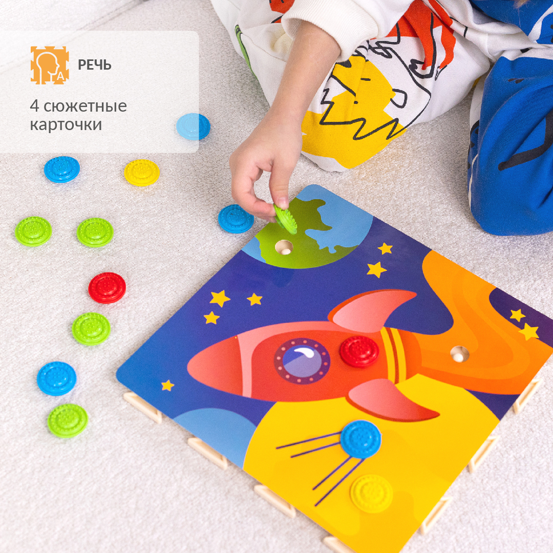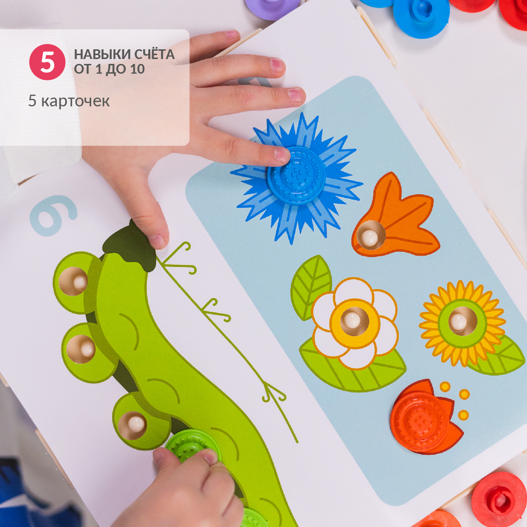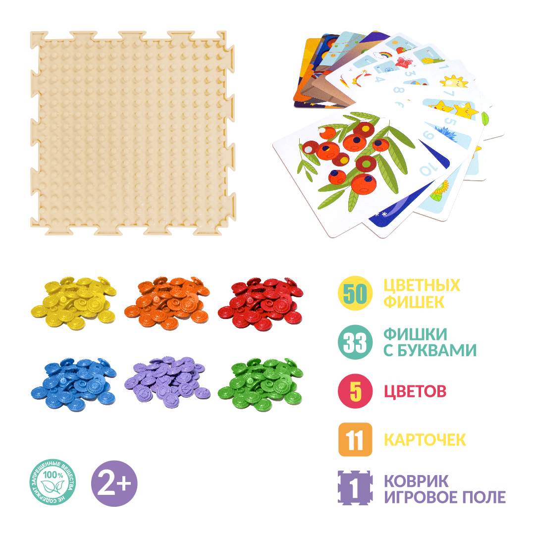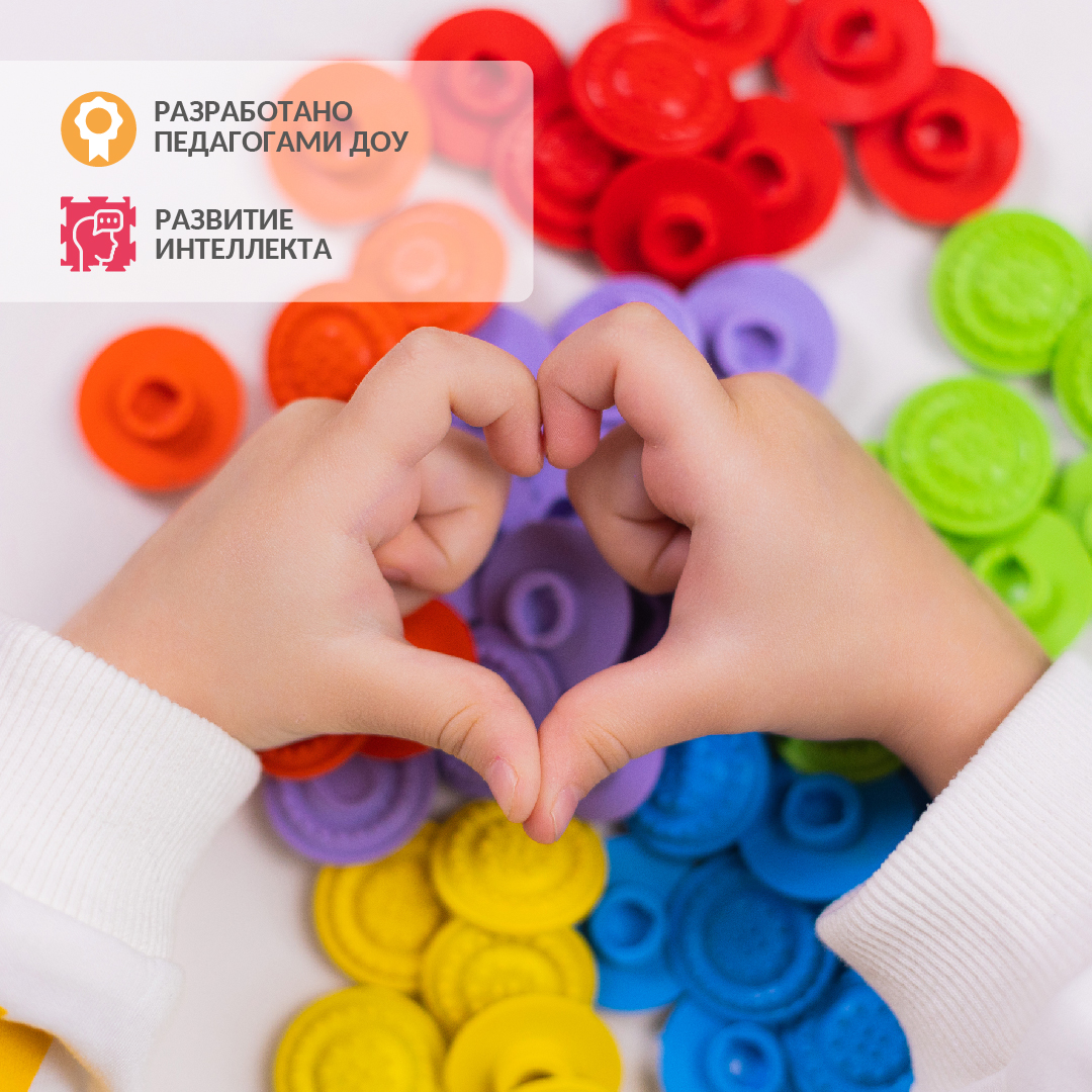 - 50 цветных фишек для изучения основных цветов. Надевая фишки на «Шипы», ребёнок сможет собрать красочную картинку согласно примерам, или, используя фантазию, создать свою.