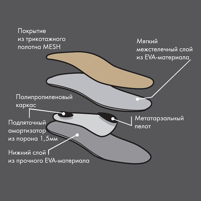 ЕVА-материал, трикотажное синтетическое полотно MESH, полипропилен, poronПоверхность изделия протирать влажной салфеткой, смоченной слабым мыльным раствором, а затем вытирать насухо. Период привыкания к стелькам составляет 3-7 дней.