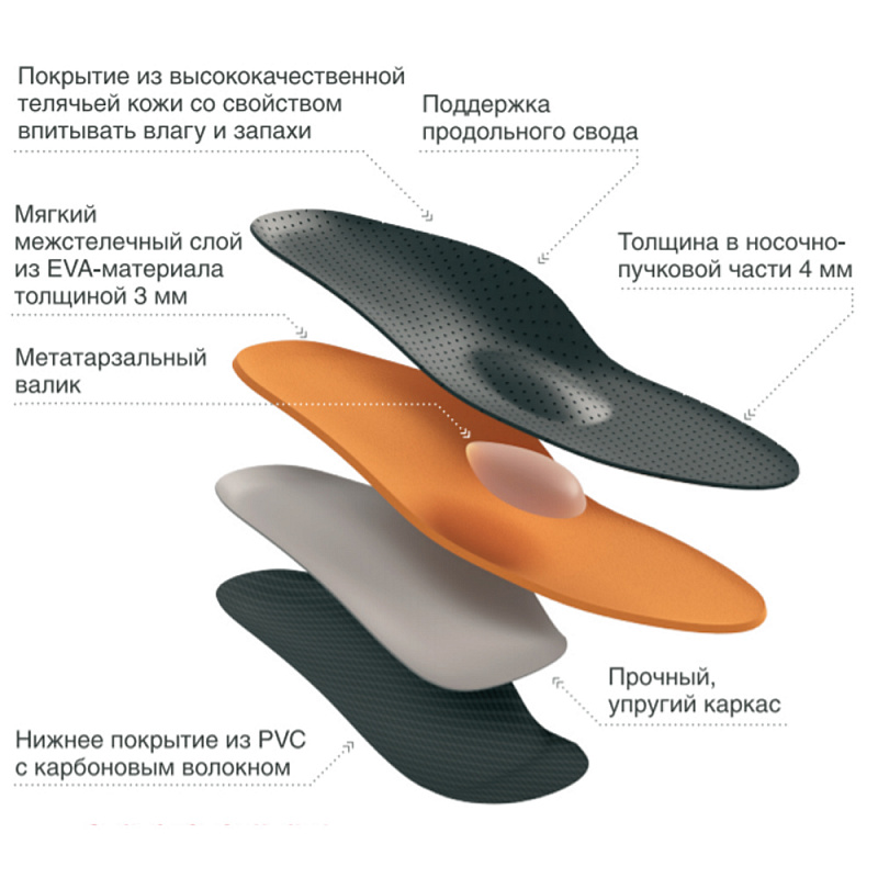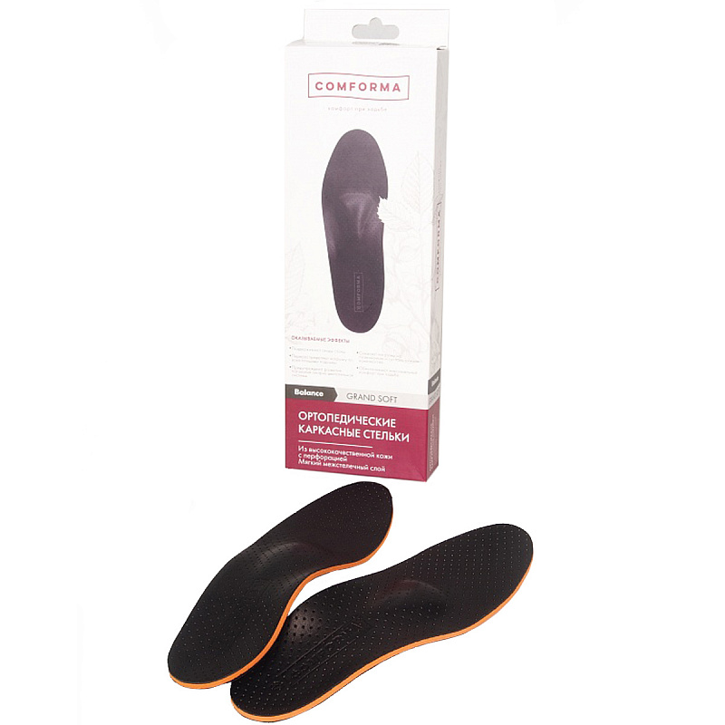 Жесткий каркас из полимерного материала обеспечивает выкладку сводов стопы.  Стельки предназначены для использования в повседневной и классической обуви.