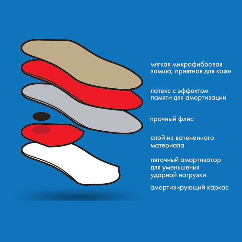 Чрезвычайно легкие стельки обладают выраженным амортизирующим эффектом, снимающим ударную нагрузку во время прыжков и бега. Умеренно разгружают и поддерживают своды стоп. Защищают от мозолей и снижают ударную нагрузку на позвоночник и суставы нижних конечностей.