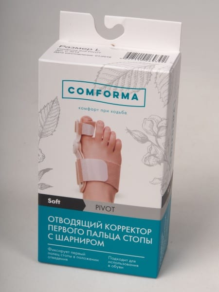 Корректор первого пальца в виде пластиковой шины с шарниром, с нанесенной на нее мягкой накладкой из пенополиуретана, надежно крепится на стопе с помощью застежки «Велкро». Изделие комфортно прилегает к большому пальцу стопы, снижает ударную нагрузку и фиксирует палец в положении отведения. Может использоваться в обуви. Корректор устраняет усталость и боль, создает ощущение легкости и обеспечивает максимальный комфорт при ходьбе.