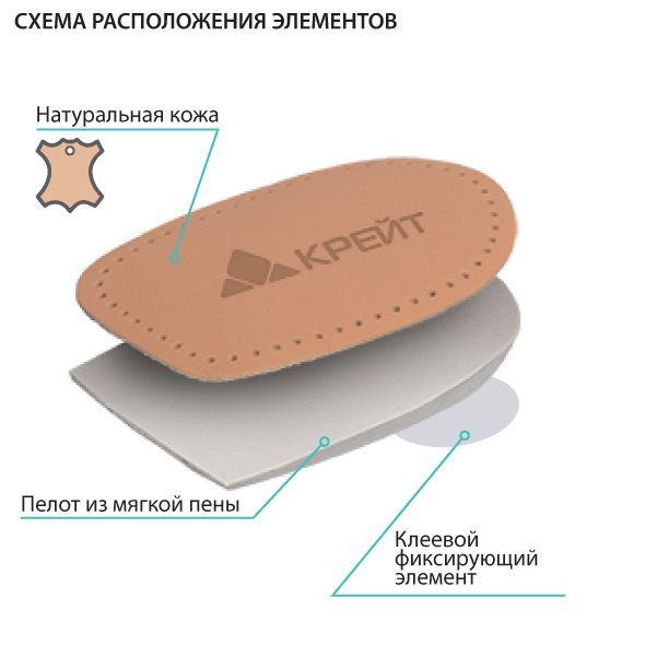 Имеют клеевой фиксатор. Состав: 50% кожа КРС, 45 % пенополиуретан, 5% полихлоропрен.