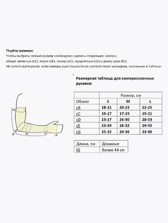 Предупреждение: убедитесь в правильности выбора размера и в правильном использовании изделия. Неправильное или чрезмерное использование компрессионного рукава или перчатки без наблюдения врача может привести к повреждению кожных покровов. В случае появления боли или раздражения на коже во время использования, немедленно снять изделие и проконсультироваться с врачом. Использование кремов, лосьонов, масел сокращает срок годности изделия. Ювелирные украшения и длинные ногти могут повредить изделие. Не надевать во время ночного сна.