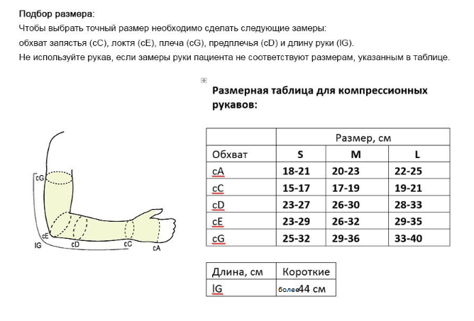 Предупреждение: убедитесь в правильности выбора размера и в правильном использовании изделия. Неправильное или чрезмерное использование компрессионного рукава или перчатки без наблюдения врача может привести к повреждению кожных покровов. В случае появления боли или раздражения на коже во время использования, немедленно снять изделие и проконсультироваться с врачом. Использование кремов, лосьонов, масел сокращает срок годности изделия. Ювелирные украшения и длинные ногти могут повредить изделие. Не надевать во время ночного сна.