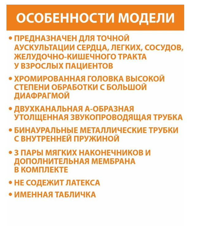 — Головка стетоскопа и звукопроводящая трубка имеют два звукопроводящих канала, отдельно для каждого уха— Оба звукопроводящих канала объединены в одно целое для исключения шумов трения друг об друга— Материал звукопроводящей трубки, оптимальная жесткость прилагаемых ушных наконечников и точность соединения частей стетоскопа исключают посторонние шумы при использовании В комплекте: головка к стетоскопу с мембраной, трубка медицинская соединительная с внутренней пружиной и встроенной бинауральной трубкой, мембрана, пластиковое кольцо, 3 вида резиновых наконечников для ушей, футляр для доп. принадлежностей, именная табличка, руководство по эксплуатации, гарантийный талон Компания «Технологии здоровья» уже 25 лет заботится о вашем долголетии.