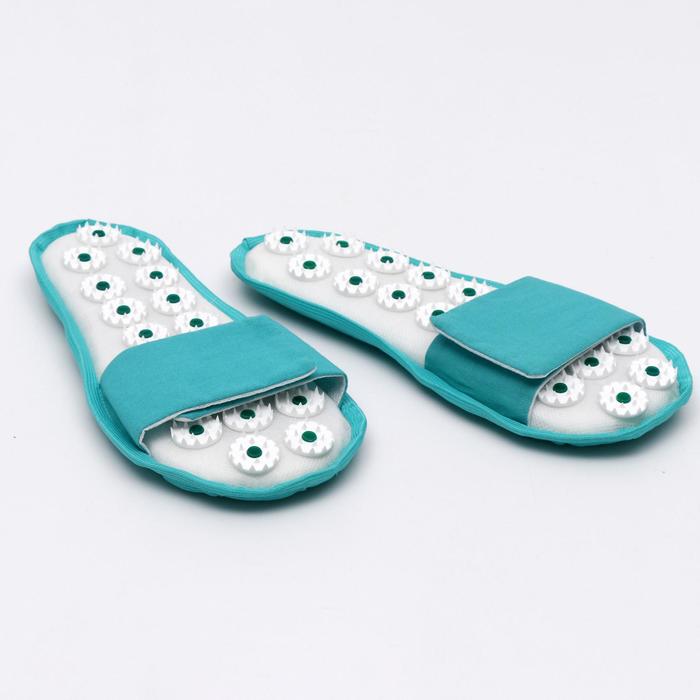 Массажные тапки с игольчатыми модулями. Размер 40-44. Удобные тапки для акупунктурного массажа стоп. Ваше здоровье находится на кончиках пальцев и ступнях – так говорили врачи Древнего Востока. Знания древности актуальны и сегодня. На наших стопах располагаются активные рефлекторные зоны, которые отвечают за работу различных органов. Акцентированное нажатие на эти точки улучшает здоровье, повышает тонус, помогают избавиться от бессонницы и нормализовать деятельность проблемных органов. Тапочки с пластиковыми игольчатыми модулями очень просты в уходе. Встаньте на колючки и надёжно зафиксируйте стопу застёжкой на липучках. Активность в массажных тапочках выбирайте самостоятельно: можете просто стоять или ходить по комнате. Пластиковые игольчатые модули наклеены на прочную тканную дышащую основу. Ноги в них не потеют.