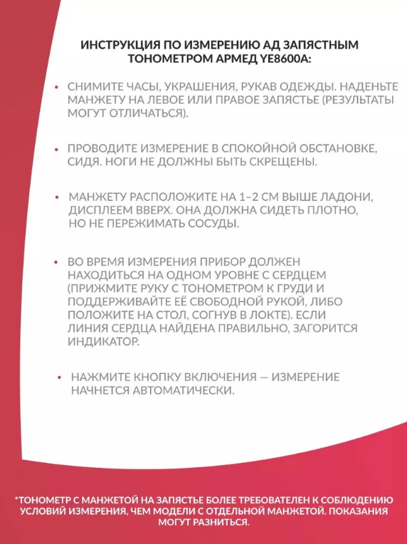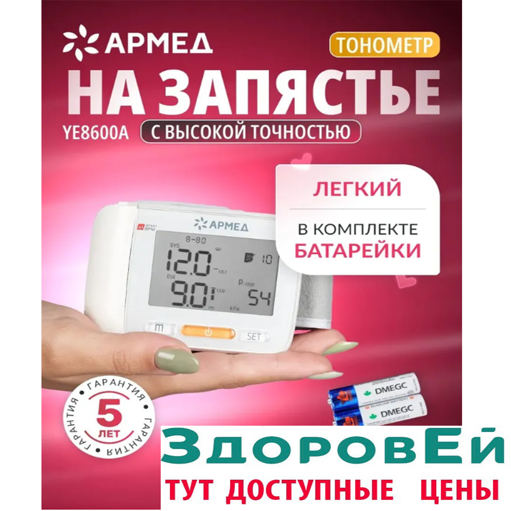 Армед YE8600A - электронный тонометр для измерения давления на запястье. Данная модель станет отличным выбором для мобильного использования, например, спортсменами, выездными врачами, к тому же его удобно брать в дорогу. Тонометр легкий и компактный, работает от батареек и оснащен самыми необходимыми функциями.