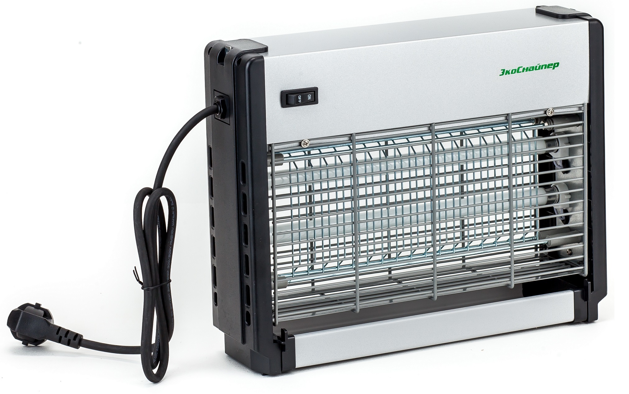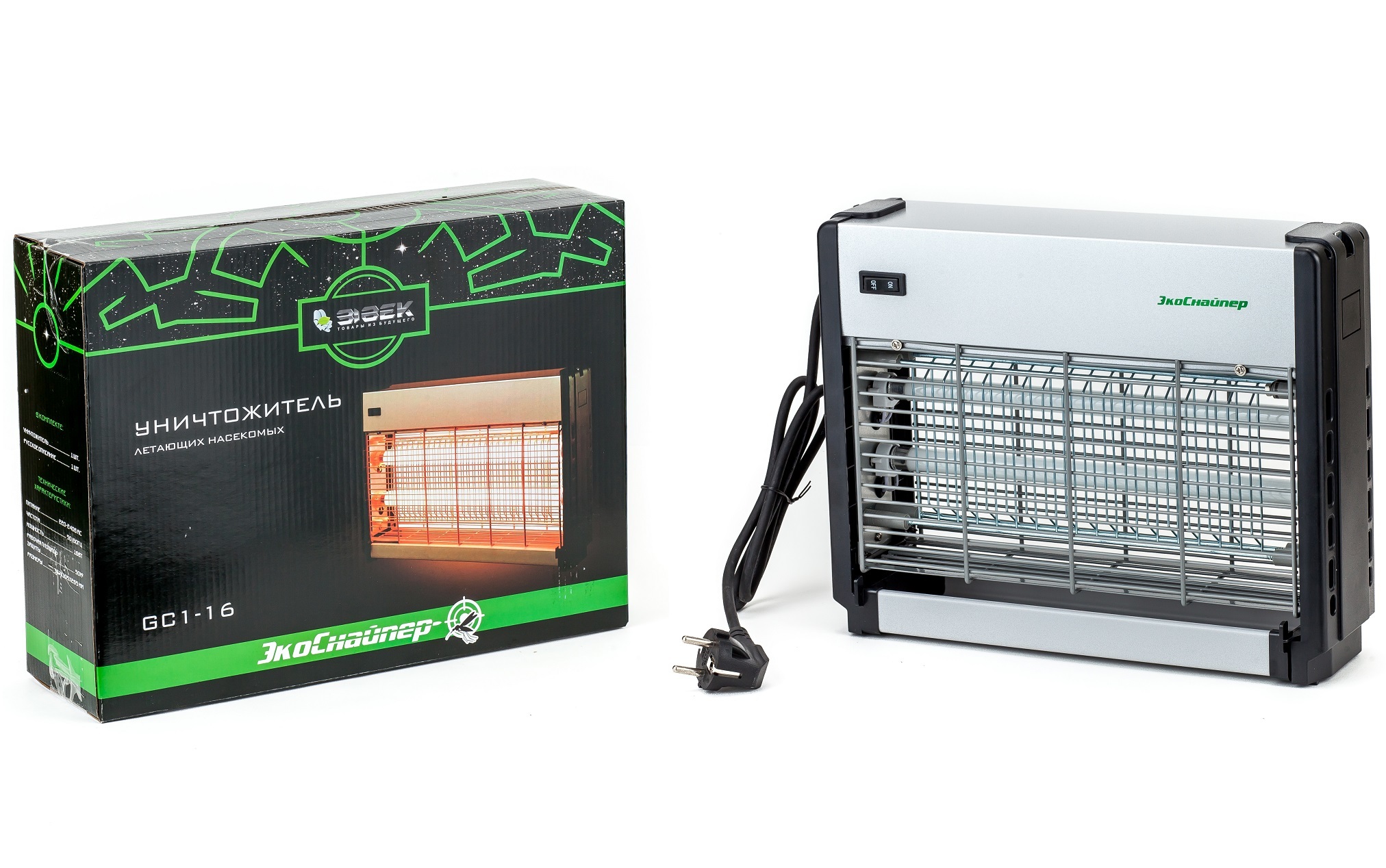 Уничтожитель летающих насекомых ЭкоСнайпер GC1-16 премиум-класса представляет собой максимально эффективную исектицидную лампу, и в тоже время простой и надежный прибор, который защитит вас от комаров и мошек. Конструктивно устройство включает в себя две ультрафиолетовые лампы (каждая мощностью 8 Вт), сетку (которая как раз и уничтожает насекомых) и лоток, предназначенный для сбора погибших насекомых. При этом уничтожение насекомых на сетке производится посредством постоянного электрического тока.