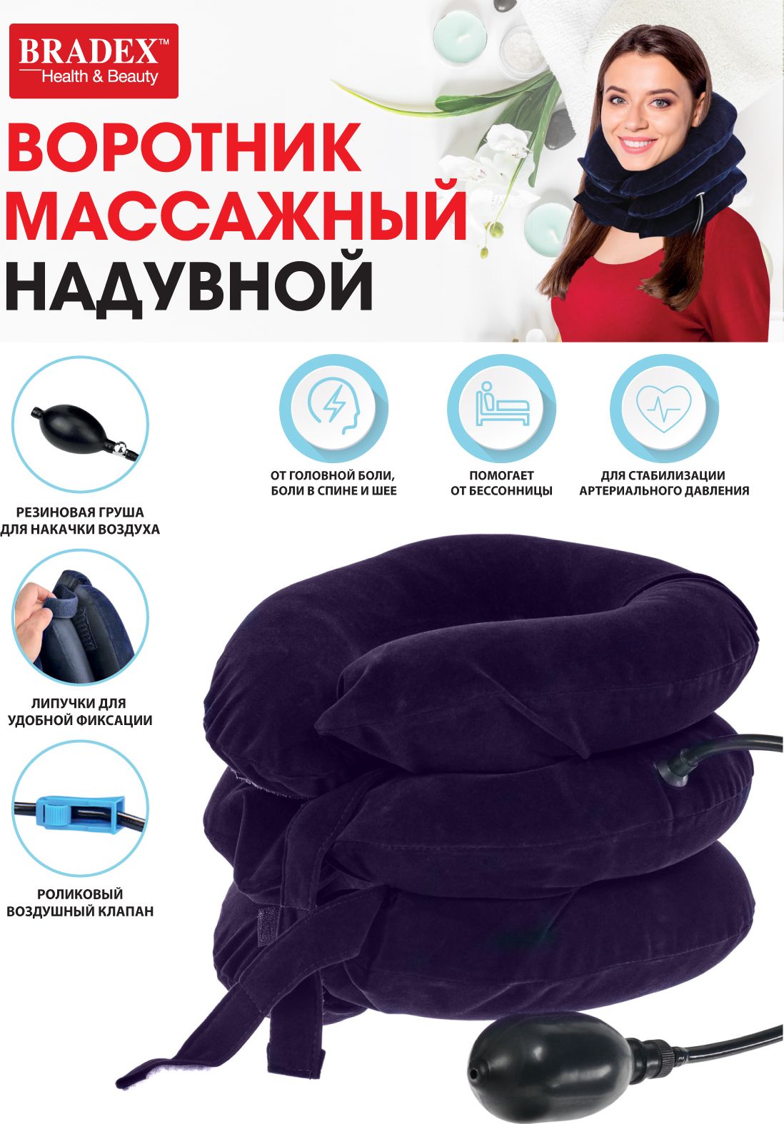 Массажный надувной воротник – эффективное средство для снятия нагрузки, мягкого вытяжения шейного отдела позвоночника, снятия зажимов и дискомфорта, улучшения кровообращения в зоне воздействия, а также питания головного, спинного мозга и работы плечевого пояса, рук и пальцев. Воротник оказывает мягкое воздействие на мышцы и связки шеи, верхней части спины. Регулярное использование воротника особенно рекомендуется людям при повышенных нагрузках и малоподвижном образе жизни, при многочасовой работе в положении с наклоненной головой, после езды за рулем, в поезде и самолете. Массажный воротник будет способствовать восстановлению подвижности шеи и деликатному снятию болезненных ощущений, а также подтяжке овала лица. Воротник рекомендован при частых головных болях и бессоннице, пониженном или повышенном давлении, нарушении осанки, остеохондрозе – не в период обострения – и при реабилитации после травм.