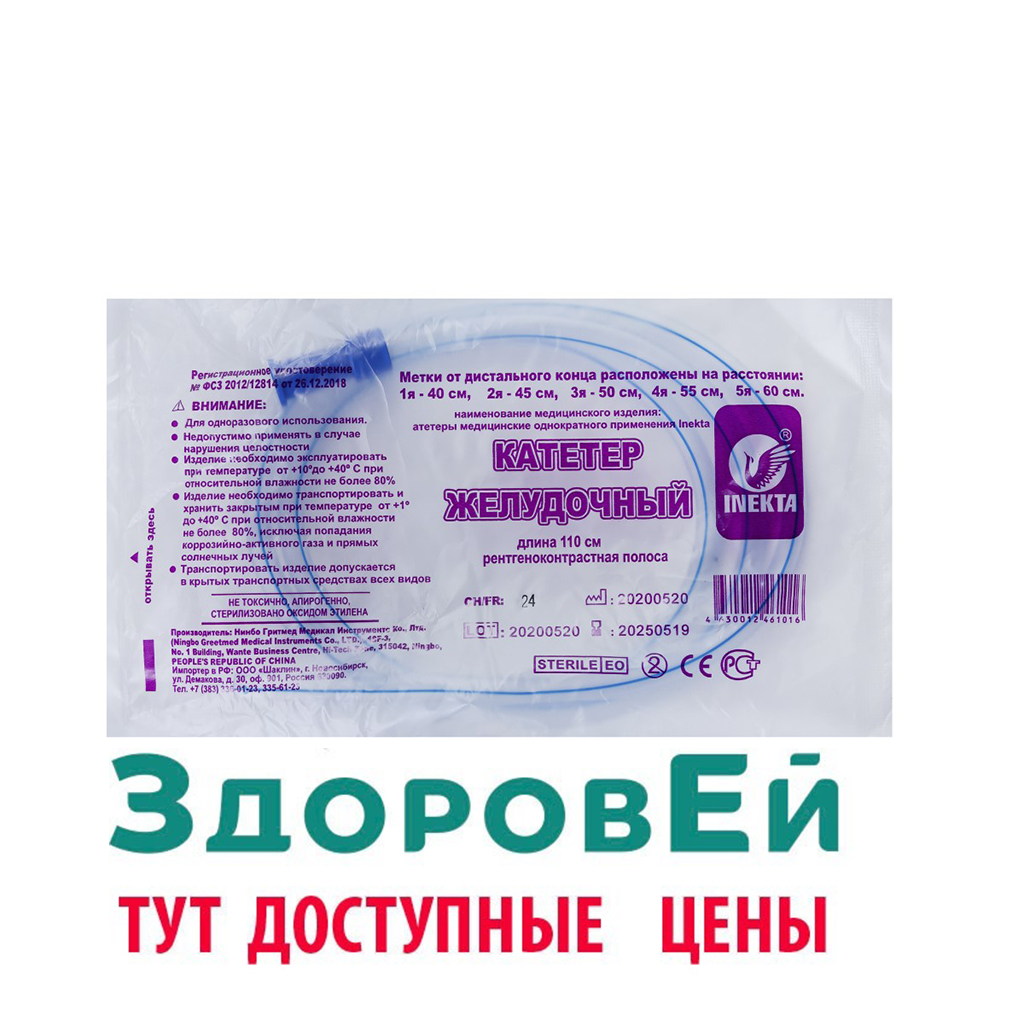 Катетер (зонд) желудочный СН24. Применяется для аспирации и промывания желудка, ввода пищи. Изготовлен из прозрачного, термолабильного ПВХ. Специально обработанная поверхность обеспечивает легкое введение. Просвет зонда не перекрывается при скручивании. Четыре латеральных отверстия большого диаметра для обеспечения эффективной аспирации. Ренгеноконтрастные маркировки. Наличие рентгенконтрастной полосы по всей длине катетера. Воронкообразный коннектор.